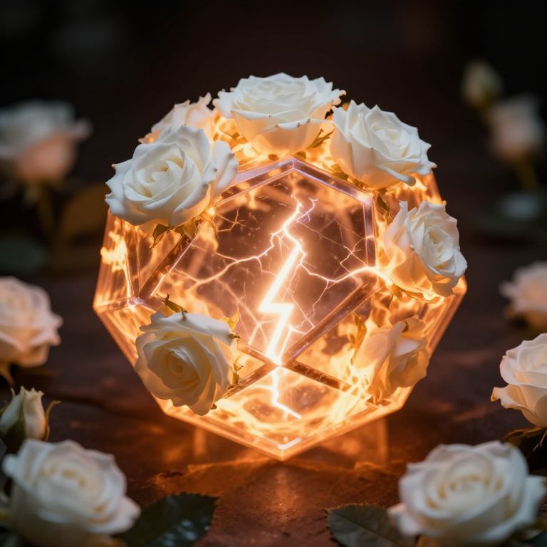 Dodecahedron awesome, pure, lightning, fire, white roses, imagination, ultra realistic photograph, peaceful atmosphere,