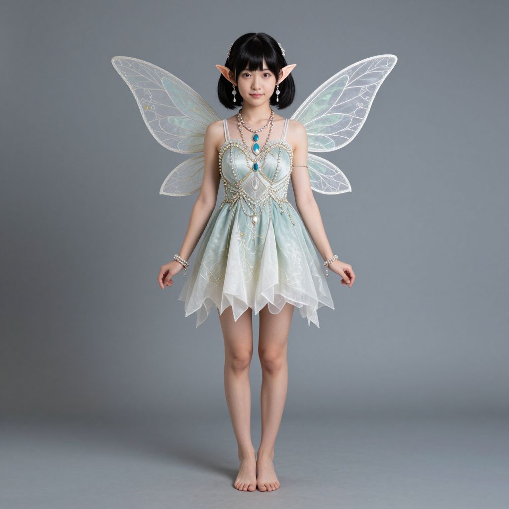 Vidia pixie hollow costume, 1girl, solo, pointy ears, wings, fairy, jewelry, earrings, fairy wings, dress, bracelet, black hair, twintails, short twintails, full body
