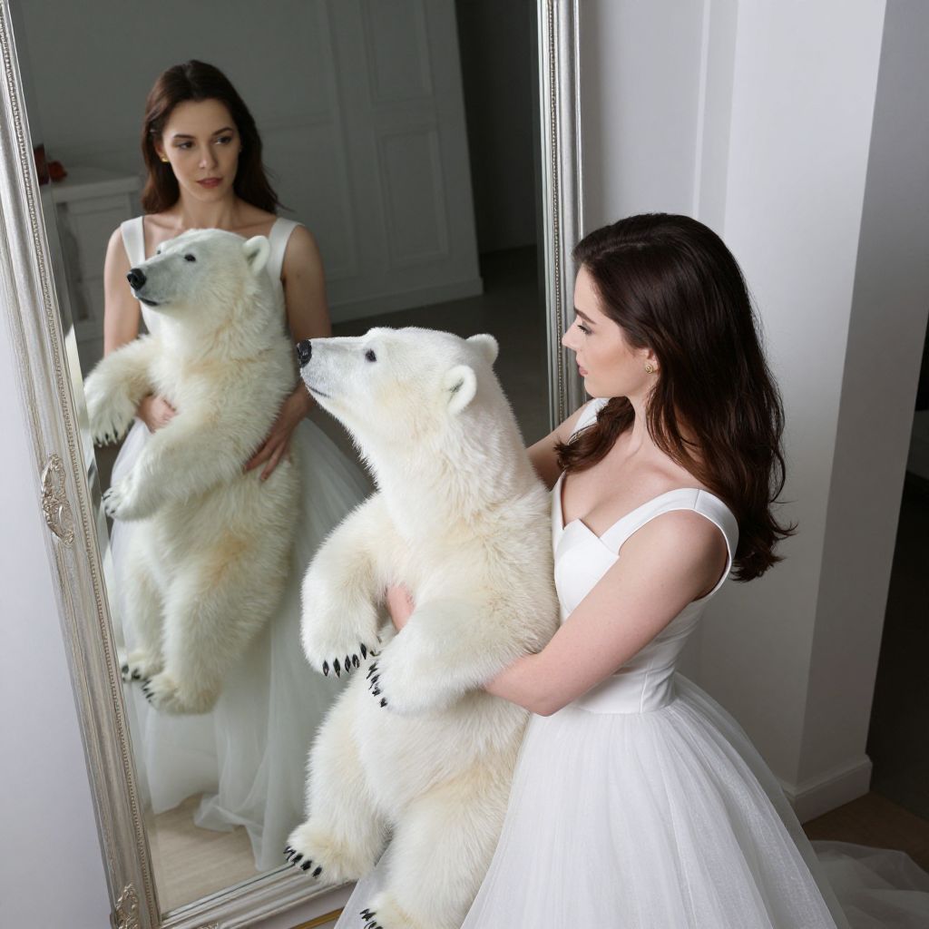 Photograph of a fair-skinned woman with long brown hair, wearing a white dress, holding a white polar bear, reflected in a large mirror in