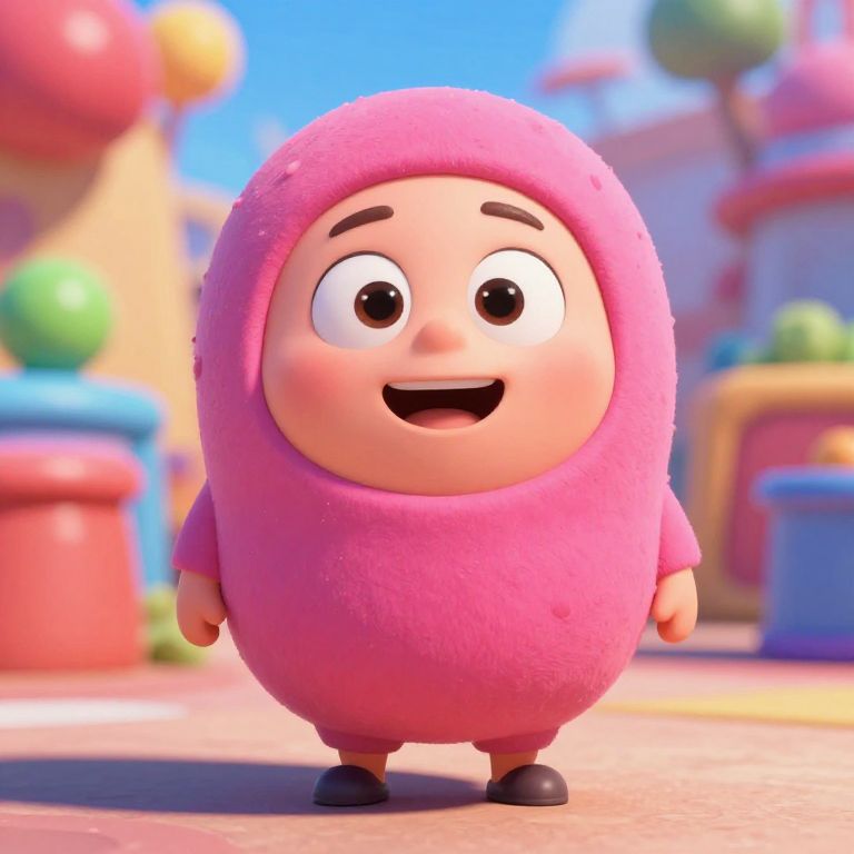 CGI cartoon character: chubby, pink, round, smiling, wearing a matching pink hooded suit, standing on a colorful, sunny playground.