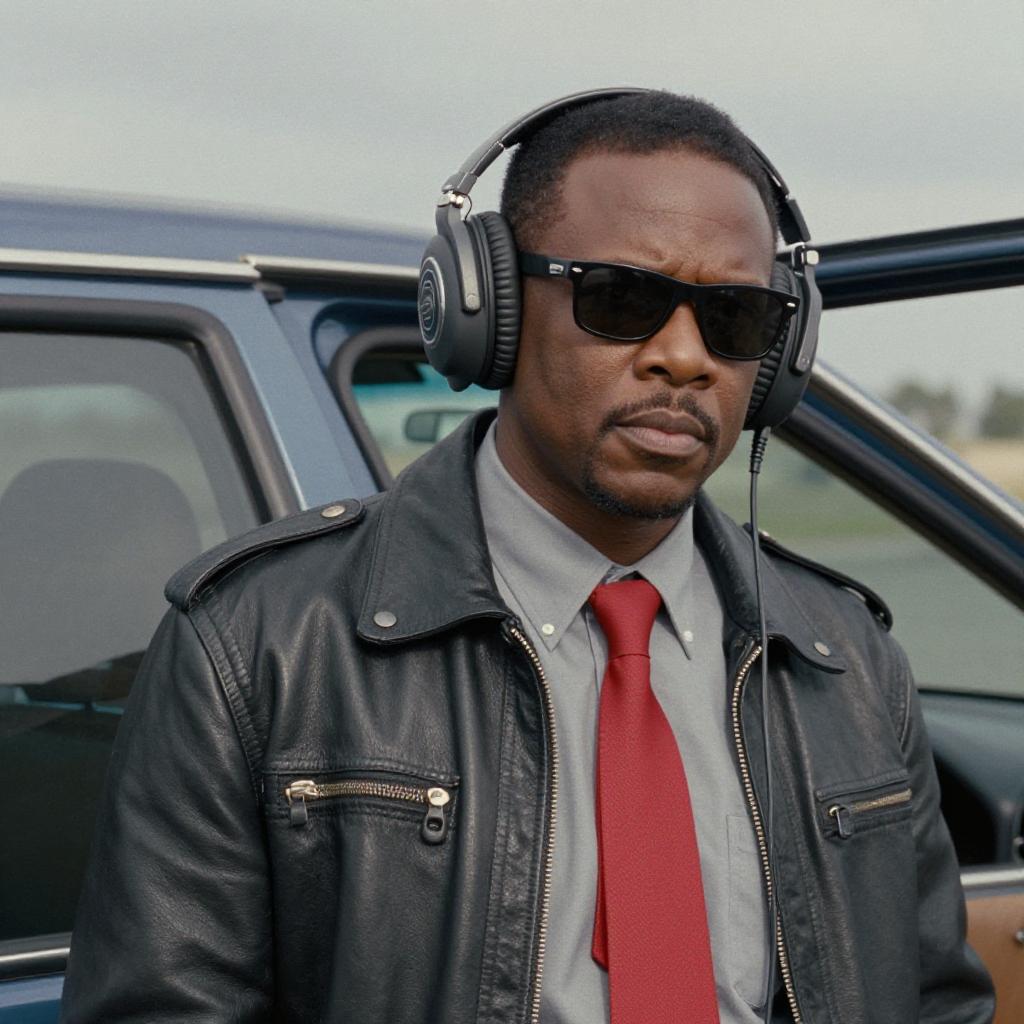 Close-up portrait of a serious-looking Black man wearing a black leather jacket over a grey shirt paired with a bright red tie. He has on black sunglasses and grey over-ear headphones. He is standing in front of a car with open doors under an overcast sky, captured with cinematic lighting. The focus is on the man's face and upper body, with slight texture visible on the leather jacket and blurred car details in the background.