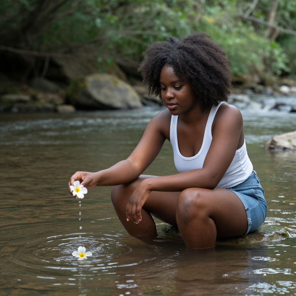 Photograph of a young Black woman with dark skin and natural, curly black hair, squatting in a shallow, clear forest stream. She wears a white tank top and blue denim shorts. She is focused on a small white flower with yellow center she is gently holding above the water, creating ripples. The background features lush greenery and rocks. The woman's expression is calm and contemplative. The lighting is natural, highlighting her skin and the water's transparency. The overall mood is serene and peaceful.