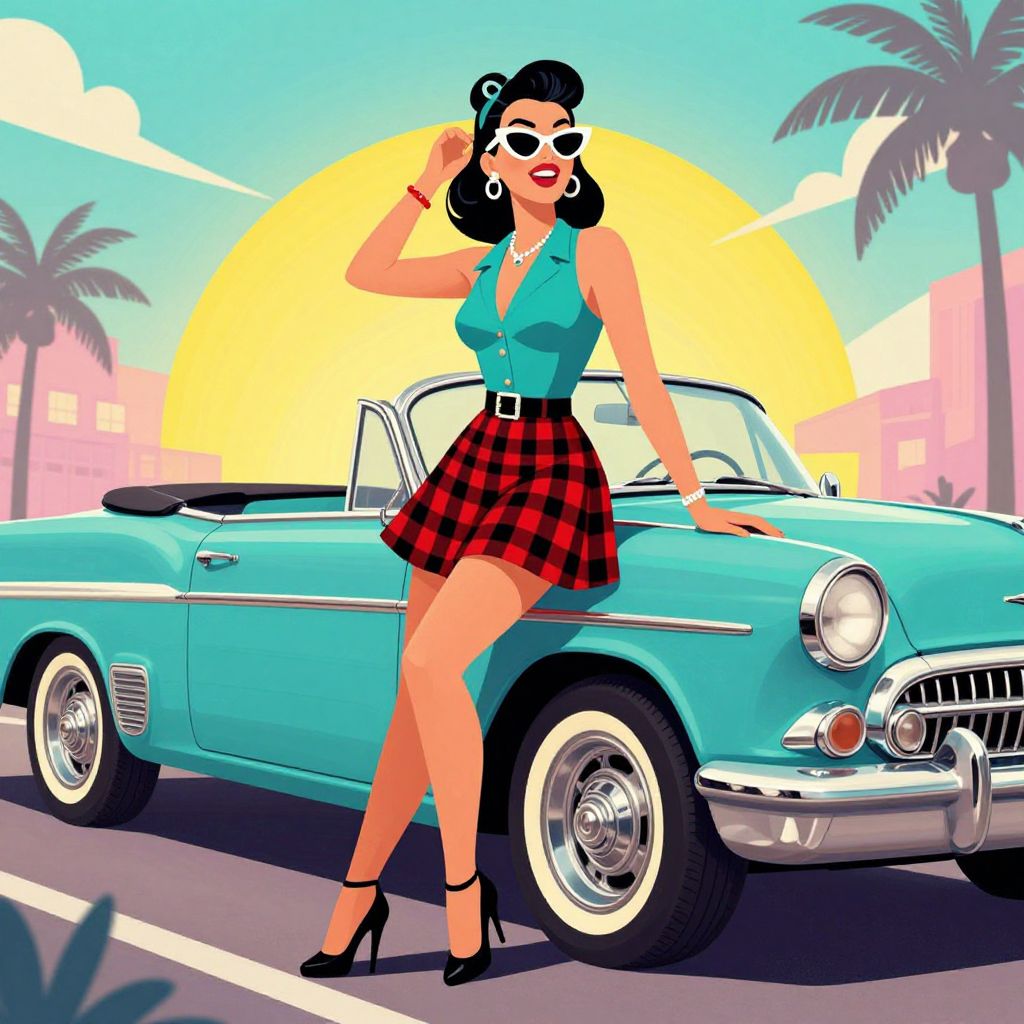 Digital illustration of a retro-styled woman in a turquoise top, red plaid skirt, and black heels, posing by a turquoise convertible at sunset with