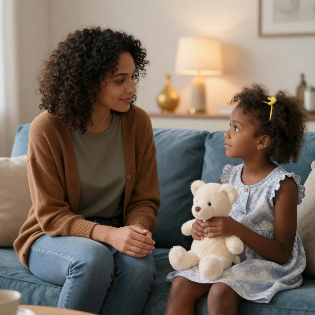 Photograph of a woman with curly brown hair and glasses, wearing a gray dress, sitting in a white bathtub facing a young boy with short brown hair, wrapped in a blue towel, holding a yellow toothbrush. They are in a tiled bathroom with a window in the background. The woman looks down at the boy, who gazes up at her.