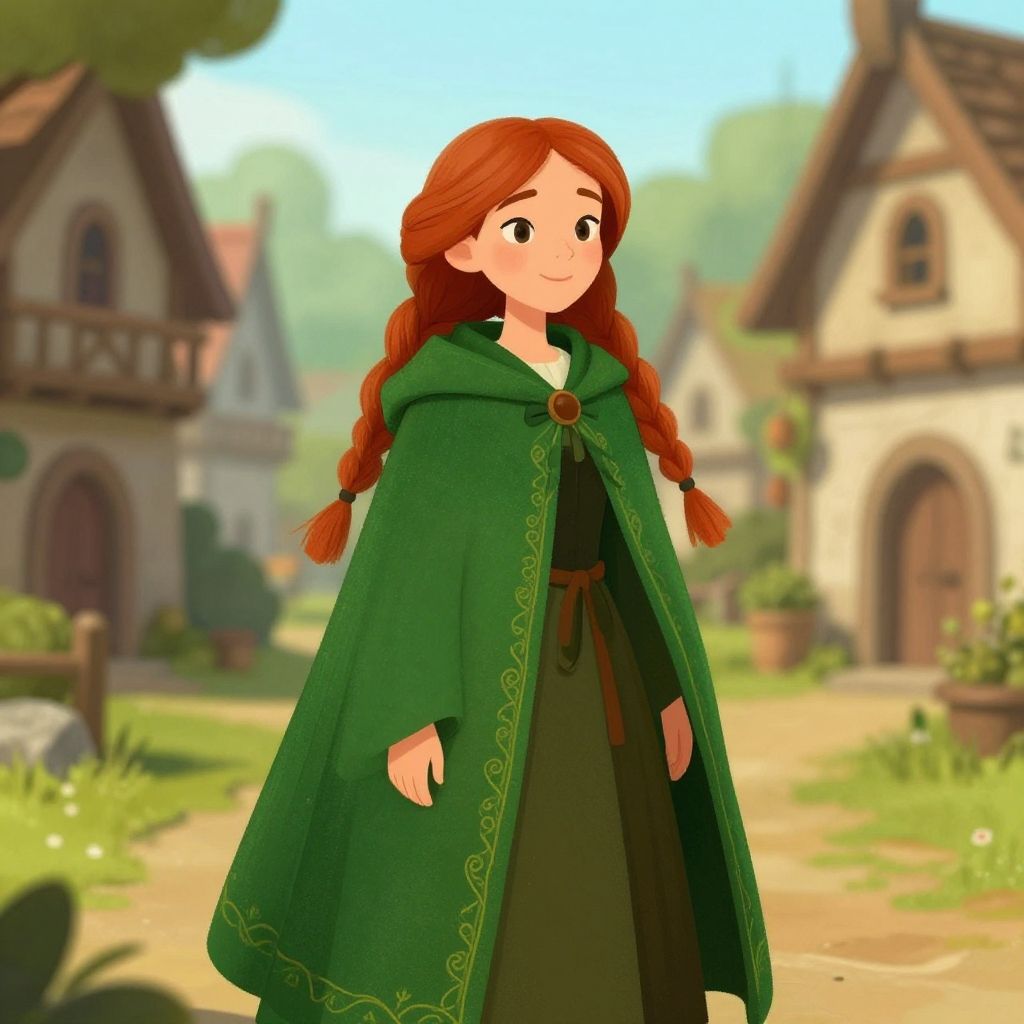 Digital illustration of a young, fair-skinned girl with long, red braided hair, standing outdoors on a sunny path. She wears a green, ornate cloak with gold trim and a matching long green dress, and a white shirt with a gold brooch. Her black shoes contrast with the green outfit. The background features a blurred, idyllic village with wooden houses and lush greenery, including trees and bushes. The image has a soft, animated style with bright, warm colors and a slightly whimsical feel. The girl has a gentle smile and large, expressive eyes.