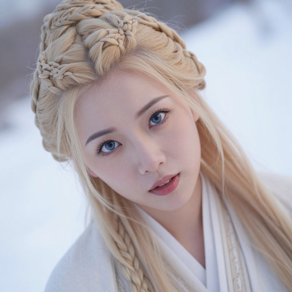 A captivating portrait photograph presents an East Asian woman with piercing blue eyes and long, golden hair intricately braided in ancient Scandinavian style. Captured from a unique worm's eye view, her expression exudes both wisdom and mischief as she stands amidst a serene winter landscape bathed in soft ethereal light. This fusion of tradition and modernity showcases the subject's timeless beauty enhanced by contemporary digital art techniques, evoking an enchanting yet relatable emotional spectrum.