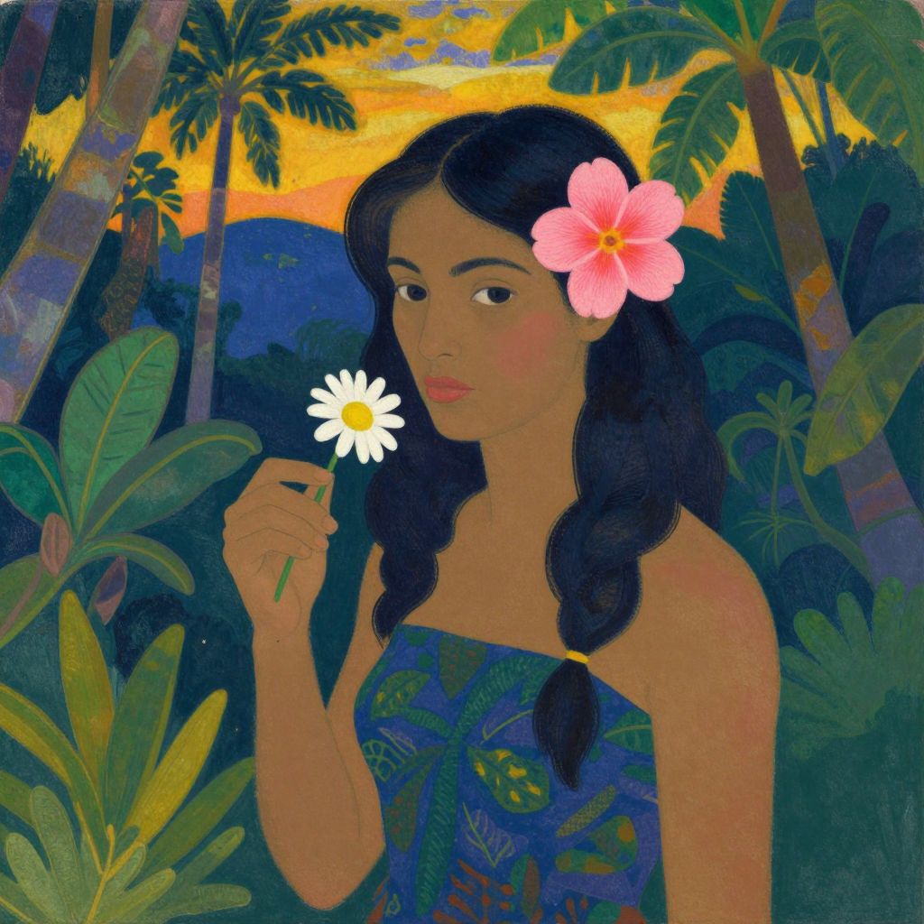 A vibrant digital illustration inspired by Paul Gauguin's style, featuring a woman adorned with a pink flower in her hair, holding a white daisy, set against a lush tropical backdrop with golden-hour lighting and detailed botanical elements.