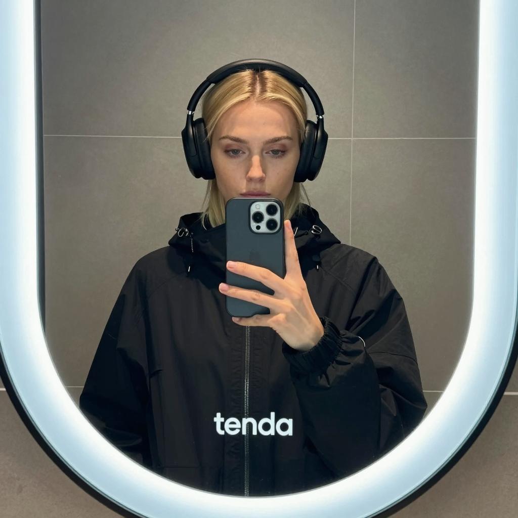 Mirror selfie of a woman with light skin and blonde hair wearing a black hooded jacket and large black headphones. She is holding a smartphone with a white camera cutout in her right hand, taking the photo in an oval mirror with a white border. The background consists of grey tiled walls, and the word 'tenda' is partially visible on the mirror.