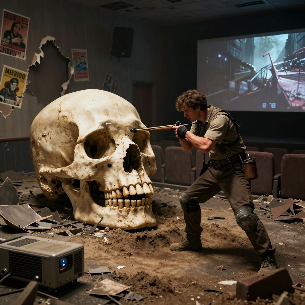 A cinematic scene of drobyshevsky Archaeologist excavates a giant giant's skull, (Pulling back a Slingshot:1.0), (Wearing Knee Pads:1.0), (in a post-apocalyptic crumbling cinema, torn posters, dusty projector, broken seats, lopsided screen.:1.0), ultra high realism, ultra high details, ultra high quality, ultra high sharpness