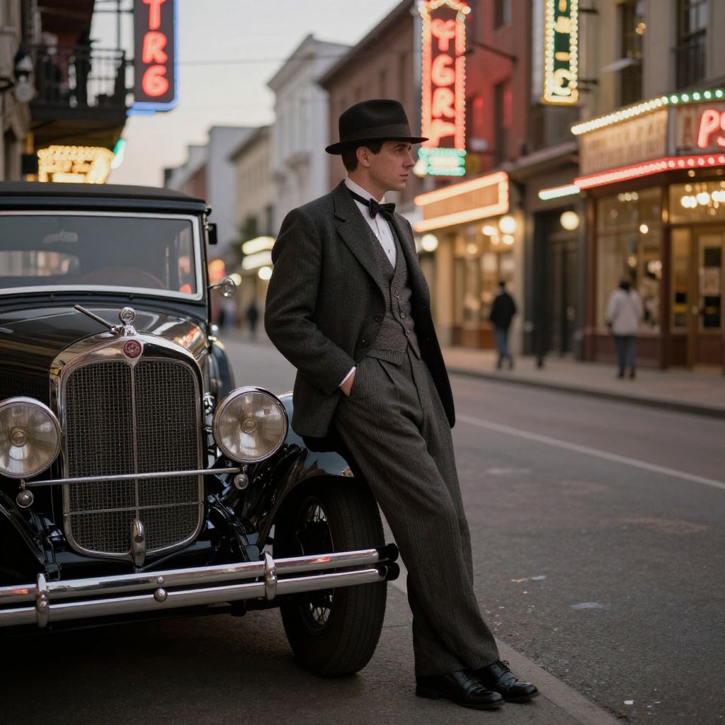 1920s businessman leaning against a classic car parked on a historic city street at dusk, wearing a stylish suit with a bow tie and hat, neon signs and vintage storefronts illuminating the background, cinematic color grading, nostalgic and stylish mood