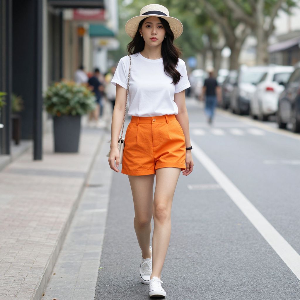 Photograph of an Asian woman with long black hair, wearing a white short-sleeve t-shirt, bright orange high-waisted shorts, white sneakers, and a wide-brimmed beige straw hat. She walks confidently down a urban street with a blurred background of parked cars, buildings, and a sidewalk with potted plants. The street has a white lane divider. She wears a black wristwatch on her left wrist. The overall style is casual and summery, with a focus on vibrant, contrasting colors. The image has a sharp focus on the woman with a shallow depth of field.