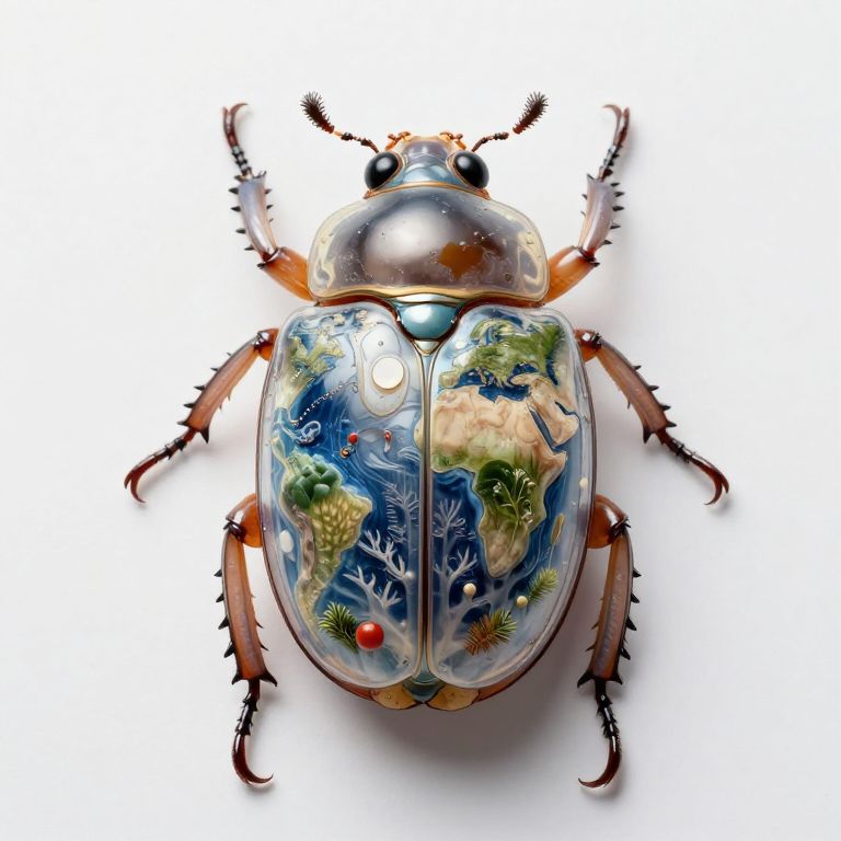 A colossal beetle with translucent shell reveals entire ecosystems within its body, as if carrying a living miniature Earth in response to forgotten evolution.