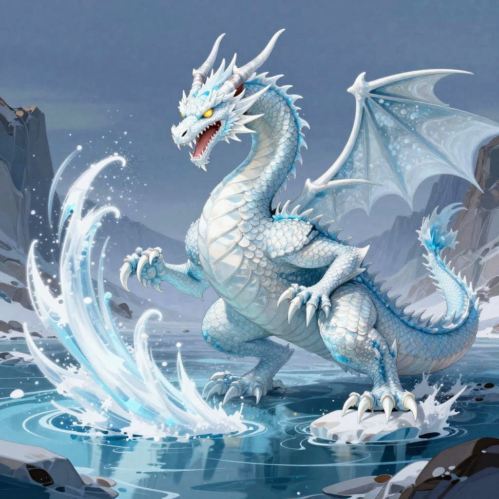 Frost wolf, fantasy style illustration, blizzard in frozen tundra, huge and muscular, blasting sound waves, icy silver fur with pale turquoise streaks, dynamic and powerful composition,