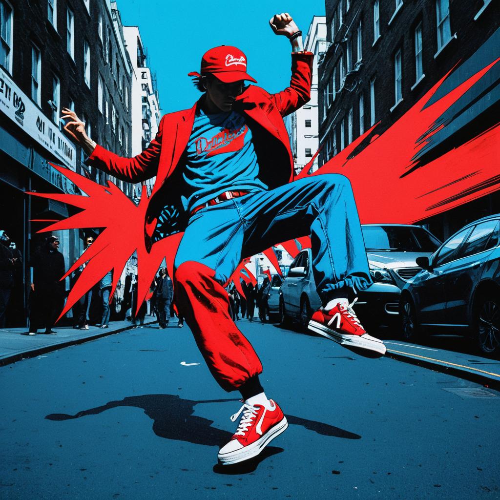 Artwork in the style of Andy Warhol presenting an energetic street dancer illustration, with vibrant reds and electric blues.