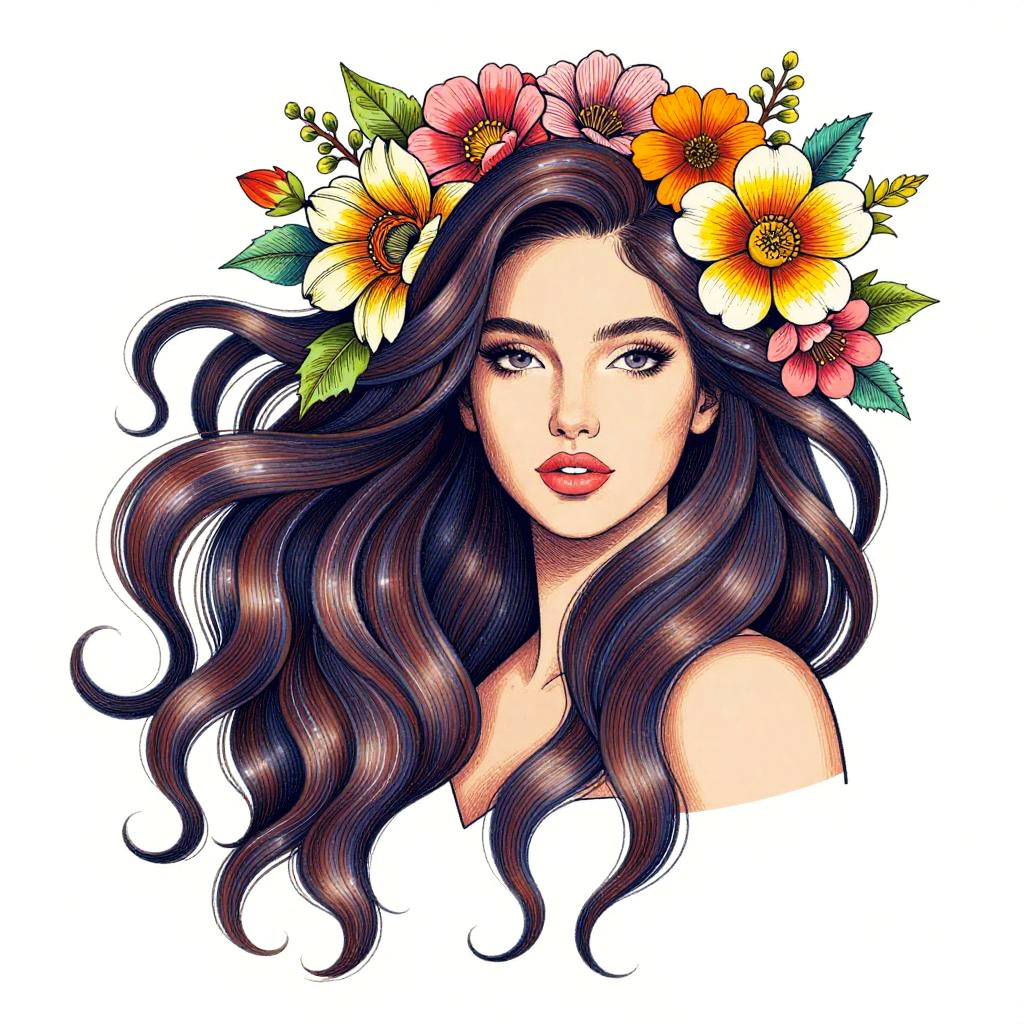 This stunning artwork features a woman with flowing, intricate hair adorned with vibrant flowers. The elegant style showcases a blend of fine lines and vivid colors, creating a harmonious composition that embodies the essence of beauty and nature.