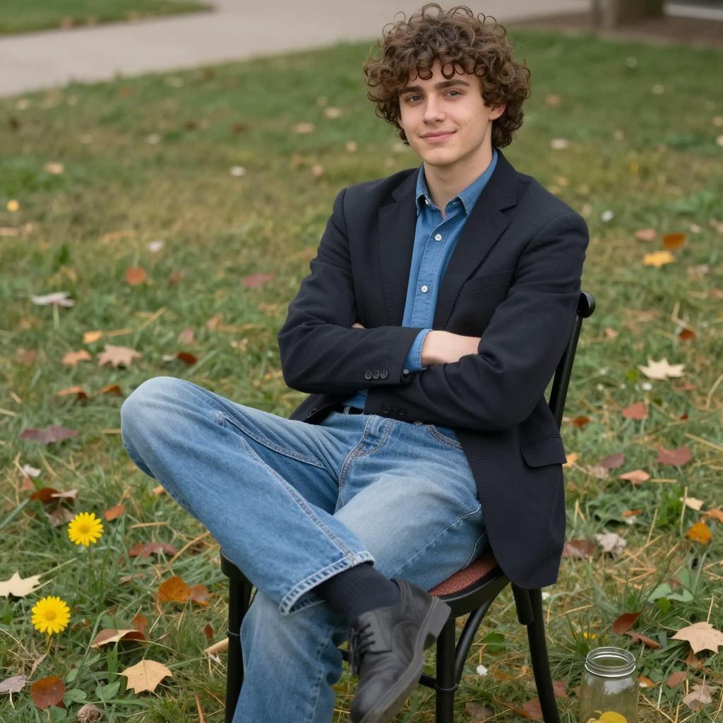 Photograph of a young man with short brown hair, light skin, and a friendly smile, sitting on a fallen log in a forest. He's wearing a navy blue button-up shirt, blue jeans, and brown boots. The background is a blur of autumn leaves and trees, with warm, natural lighting. Camera angle is slightly low, capturing him from the front. Depth of field is shallow, focusing on the man while the background is softly blurred.