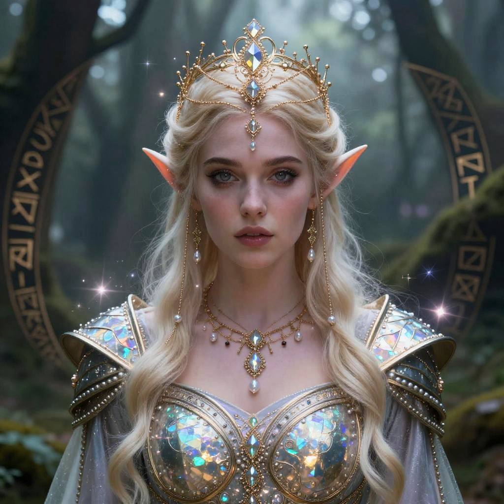 Fantasy portrait of a blonde hair blue eyes elf with intricate jewelry and a mysterious name tag, ethereal atmosphere, lush forest background, highly detailed
