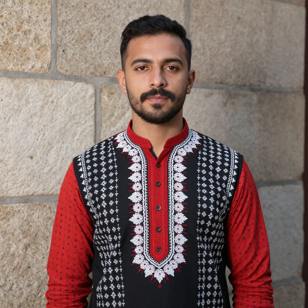 Photograph of a young South Asian man with medium brown skin, short black hair, and a trimmed mustache, standing against a textured stone wall. He wears a traditional black vest with white intricate patterns over a red, long-sleeved, button-up shirt. The vest's design features symmetrical, ornate white motifs. His expression is neutral, and he gazes directly at the camera. The stone wall in the background is composed of large, light gray bricks. The lighting is natural, highlighting the textures and colors of his clothing and the wall.