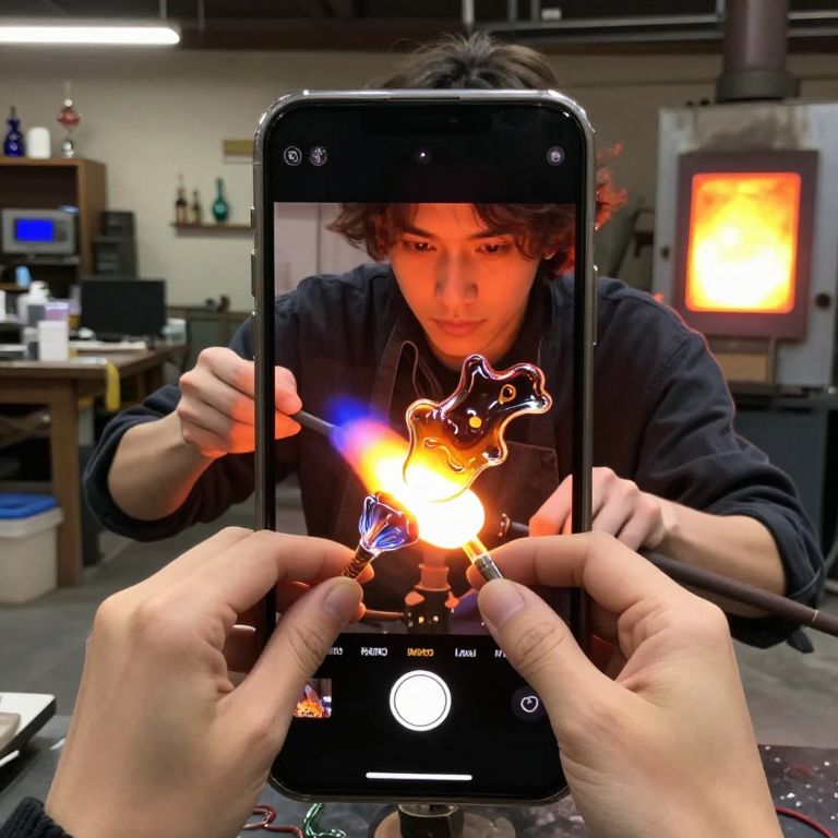 Create a hyper-realistic digital art portrait with a smartphone camera, depicting a skilled glassblower with hands that reflect a shabby-chic aesthetic. Capture the artist delicately shaping molten glass into an intricate sculpture within their vibrant workshop. The composition should be from a first-person perspective, as if viewing this scene through the eyes of one of the translucent pieces being crafted. This unique viewpoint reveals an emotional gradient that transitions from the fiery heat of the furnace to the serene focus of the artist in their creative sanctuary.