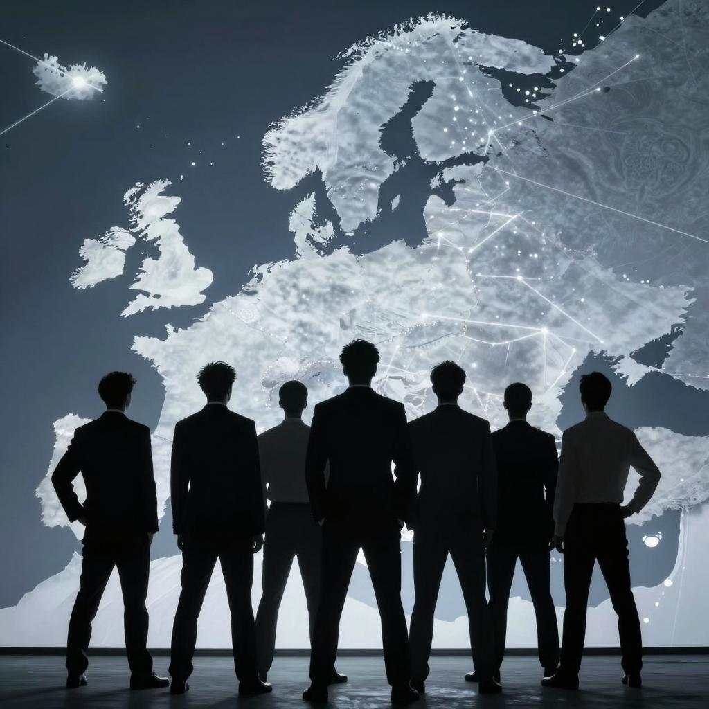 Silhouetted group of six men in suits, backs to the camera, standing in front of a large, illuminated map of Europe with bright, diagonal lines and dots. Men's hands on hips or arms raised. Low, dramatic lighting. Map occupies background.