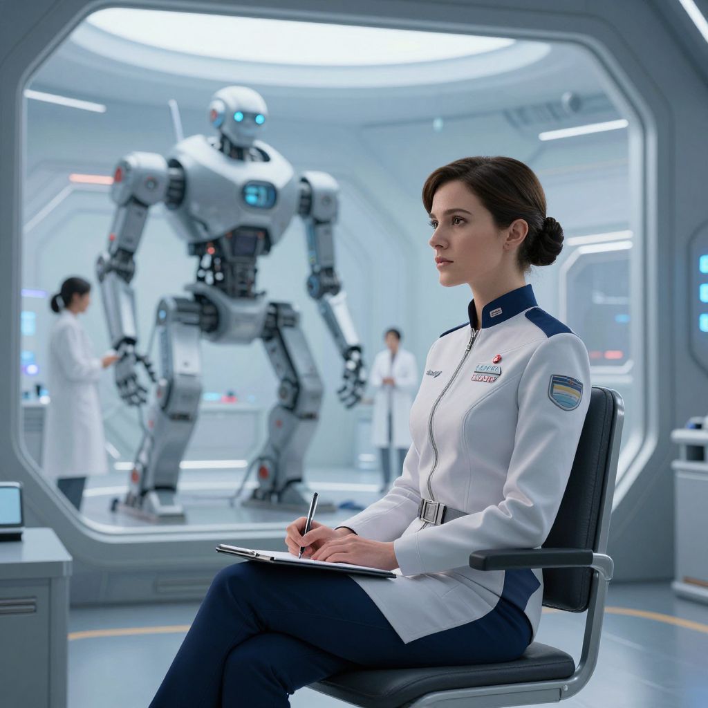 This digital CGI image depicts a sci-fi laboratory setting. A young woman with fair skin and brown hair, wearing a white, long-sleeve, military-style uniform with black trim and a badge on the left chest, sits on a black stool in the foreground. Her expression is focused. In the background, through a brightly lit, hexagonal window, a large, silver, humanoid robot with blue lights stands. Two scientists in white lab coats, one male and one female, are working at a table to the left. The laboratory has a sleek, futuristic design with grey walls and blue accents. The scene is illuminated by overhead lights.