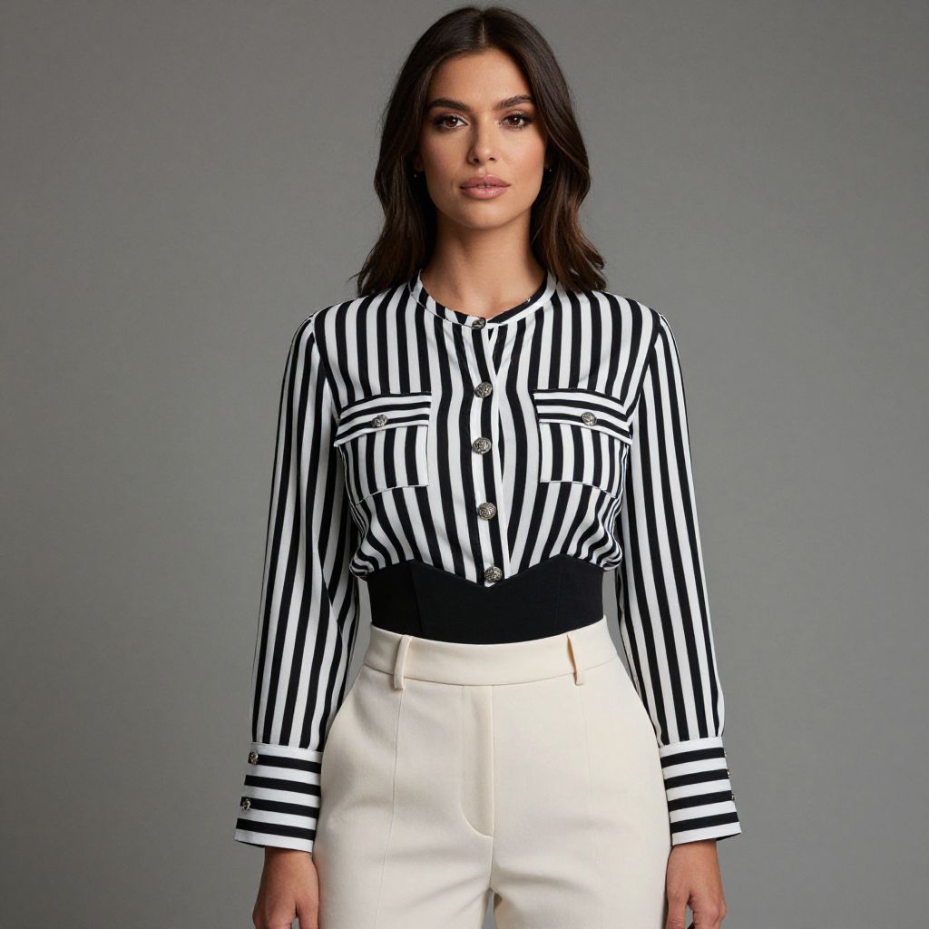 "Woman, modern business casual, black and white vertically striped blouse with contrasting horizontal cuff detail, dual flap pockets, ornamental silver buttons, black V-shaped panel at the waist, paired with high-waisted off-white trousers, neutral background.. Sexy. Pretty face and beаutiful eyes. Big breasts."