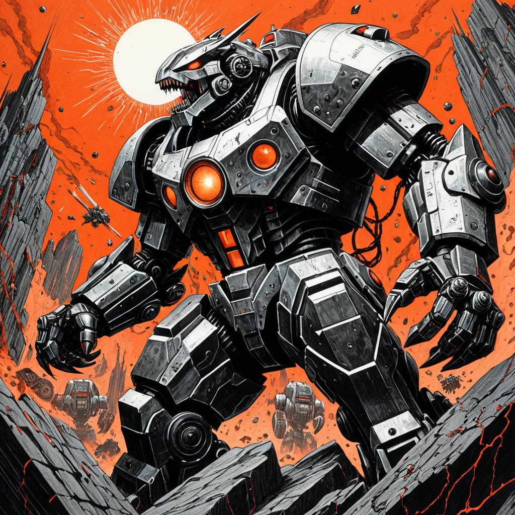 A hyper-realistic illustration of a gigantic mech beast with gunmetal gray armor and glowing orange core, set against a vibrant burnt orange sky. The mech features sharp, angular mechanical details inspired by sci-fi and fantasy styles. Surrounded by rocky, cracked terrain with smaller mech figures in the background, the scene captures intense combat energy and cinematic lighting effects with ancient patterns and textures.