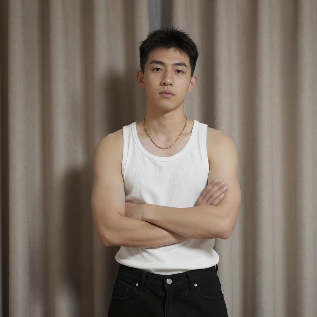 Portrait of a young East Asian man with short black hair wearing a white tank top, black pants, and a gold chain necklace. He stands with his arms crossed in front of a beige curtain. The photo highlights his muscular arms with neutral facial expression and bright lighting.