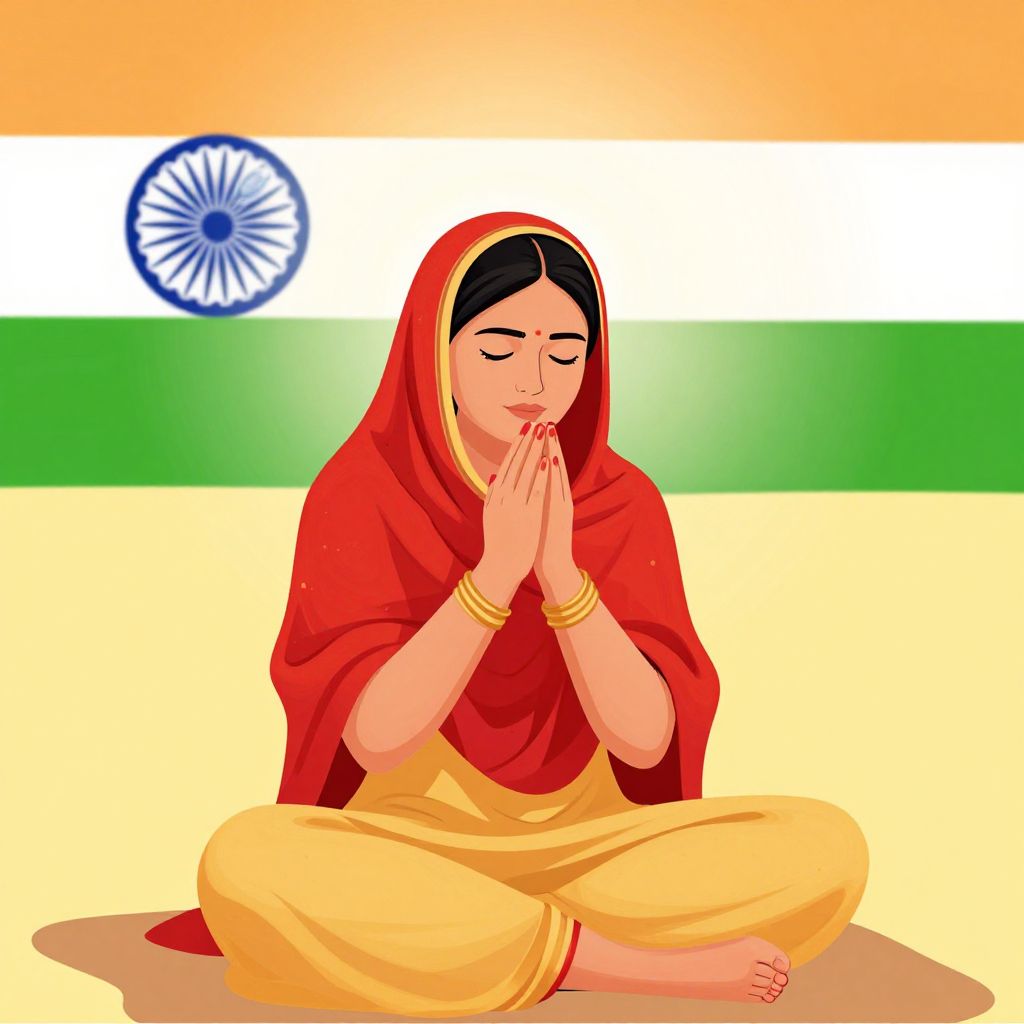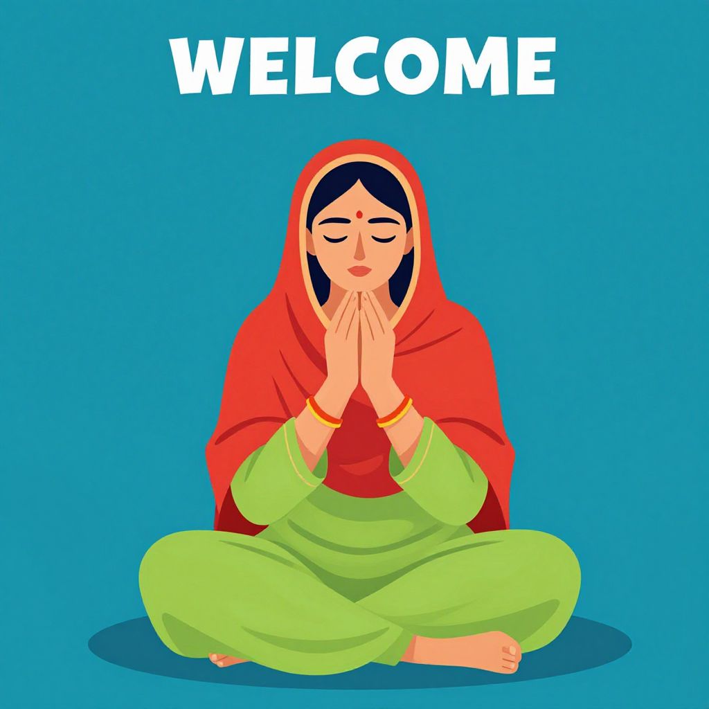 India , welcome, woman in red headscarf praying illustration.