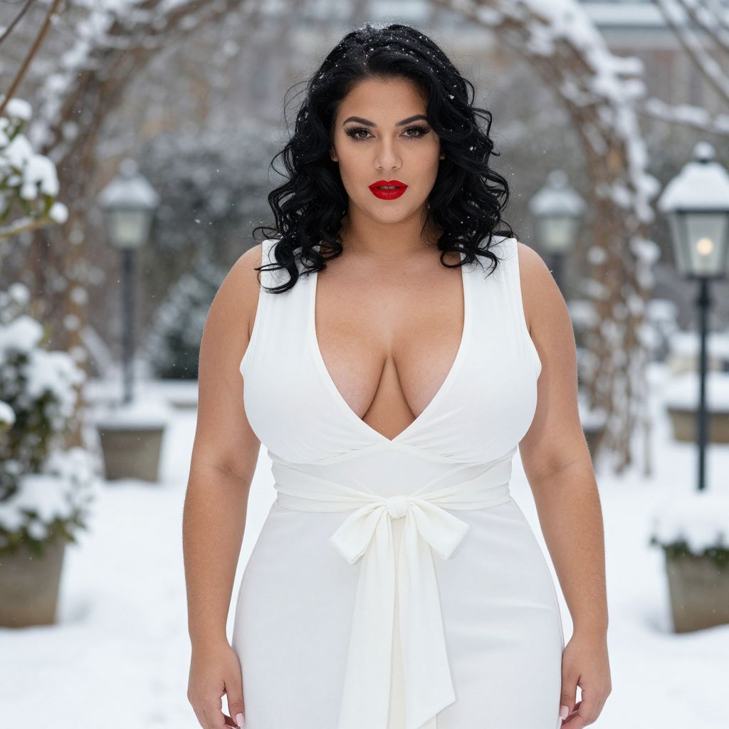 Photograph of a plus-sized woman with long, curly black hair and fair skin standing in a snowy garden. She wears a low-cut, sleeveless white dress that accentuates her large breasts. Her red lipstick contrasts sharply with her white dress and the snowy background. The garden has snow-covered arches and potted plants, with blurred street lamps in the distance. Her confident stance and direct gaze at the camera exude self-assurance. The image has a high-contrast, slightly over-saturated color style, emphasizing her features and the snowy environment.