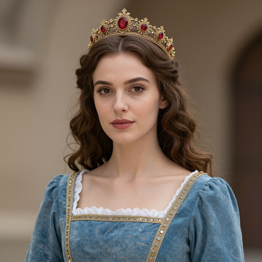 Medieval themed dress, a close up of a woman in a blue dress and a crown