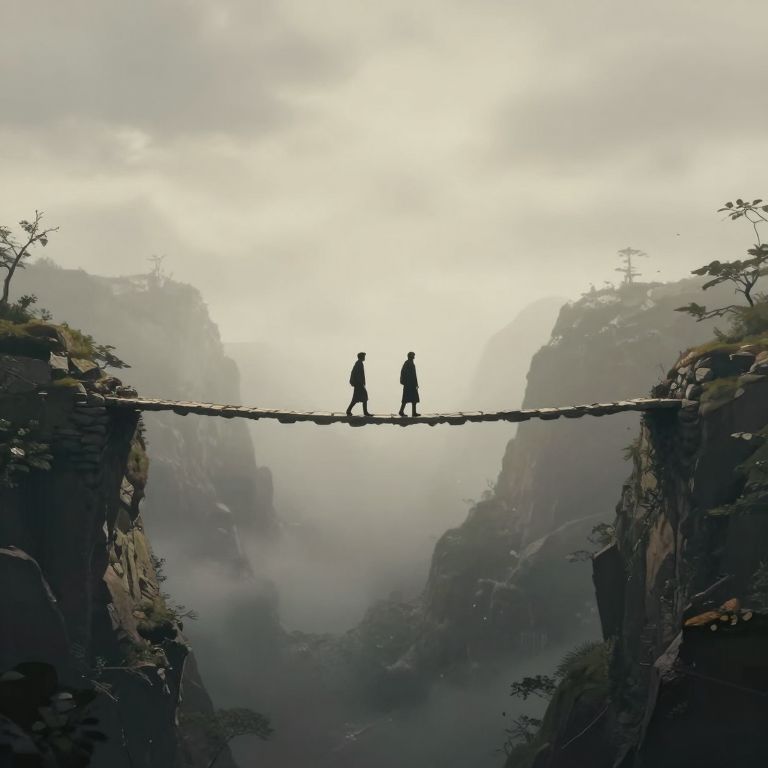 Silhouetted couple walking on a narrow, rocky suspension bridge between misty, towering cliffs in a moody, foggy landscape. Digital art