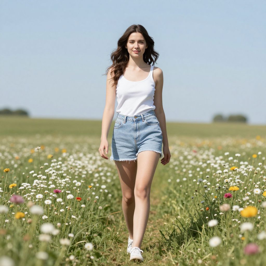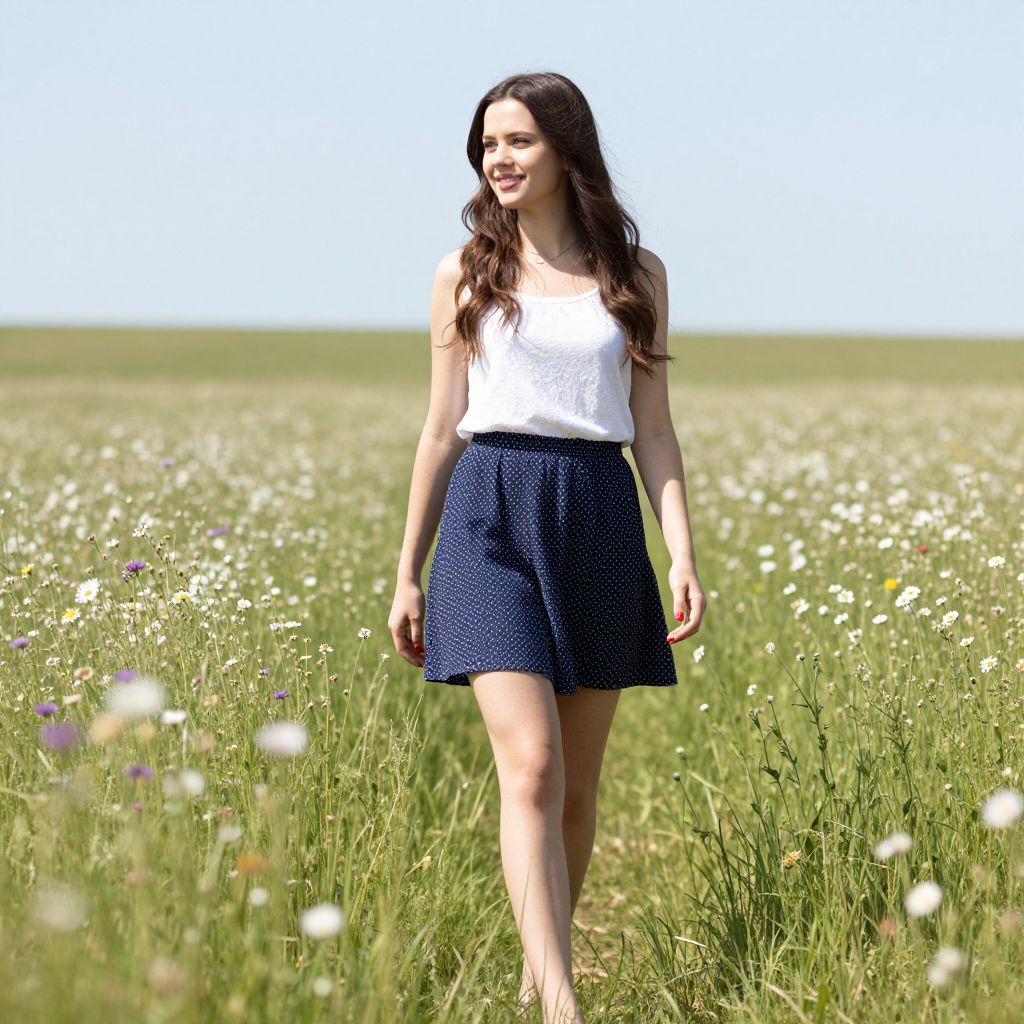 Photograph of a young woman with long, wavy brown hair and fair skin, walking through a lush, sunlit meadow filled with white and purple wildflowers. She is wearing a sleeveless, white, textured blouse and a high-waisted, navy blue, polka-dot skirt. Her expression is relaxed and she is smiling slightly. The background features a clear, bright blue sky and an expansive green field stretching to the horizon. The lighting is natural, casting soft shadows. The image has a slightly vintage, slightly blurred effect, giving it a dreamy, nostalgic feel.