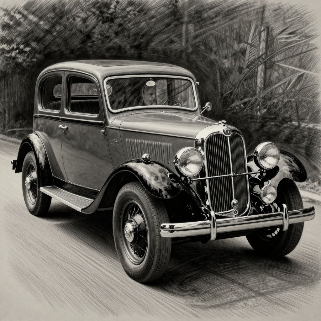 Ultra realistic (full figure:1.4) color pencil drawing of a 1930s classic Skoda 422, Dark theme, dynamic lighting, (stark contrasts), (photo realistic), uhd, 8k