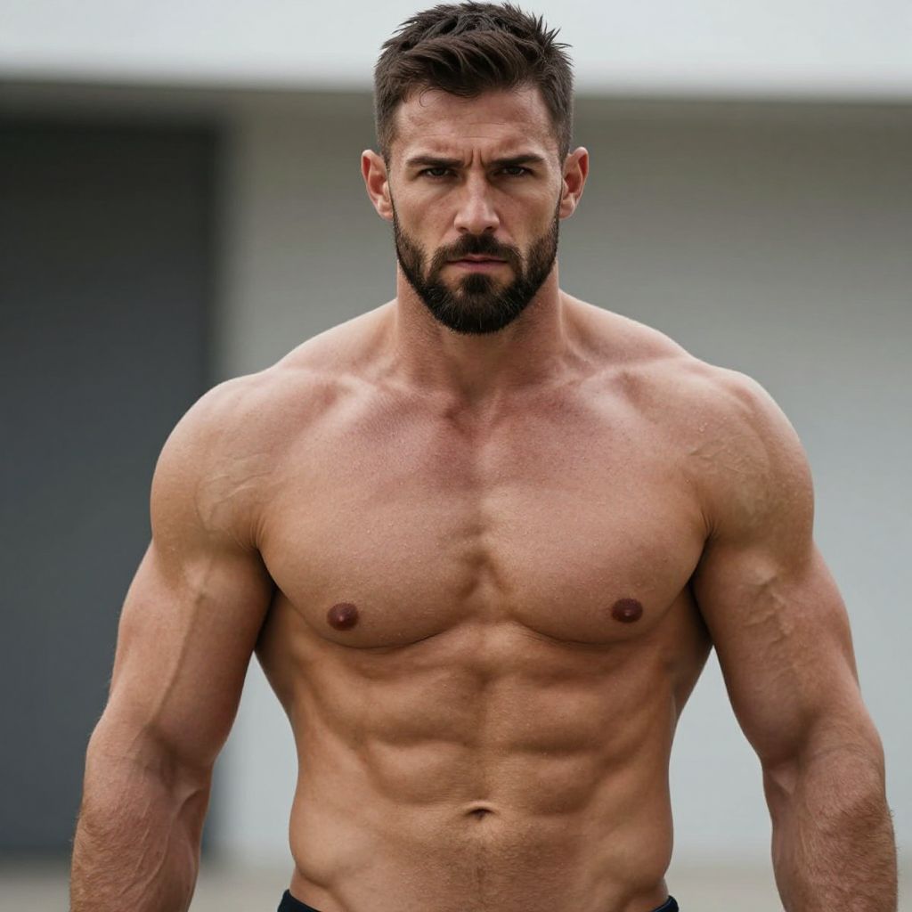 Photograph of a muscular, bearded man with short dark hair, standing topless, showcasing a defined, chiseled physique against a blurred,