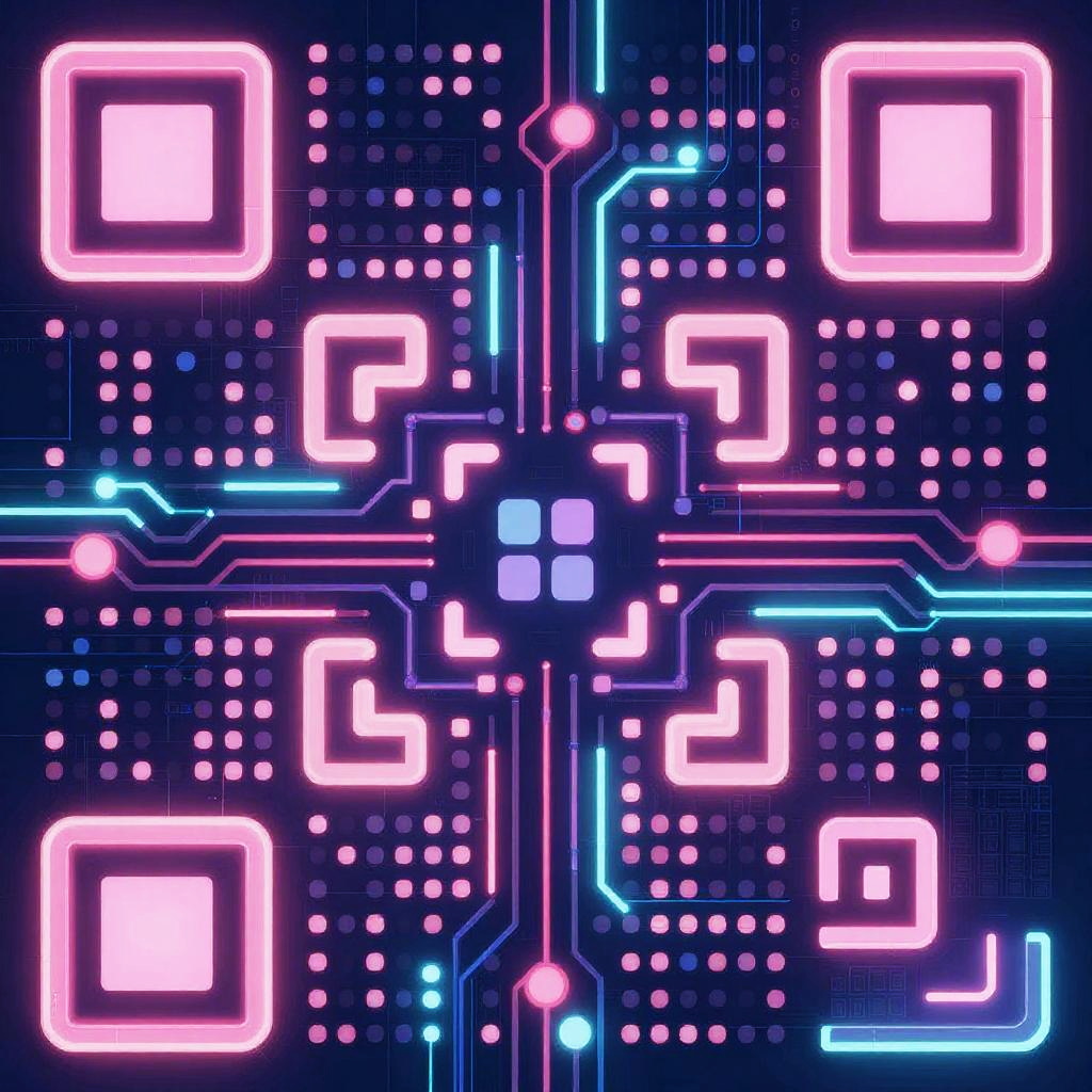 AI QR code art, intricate futuristic patterns blending traditional QR code elements with vibrant neon colors, abstract digital textures, glowing circuits, cyberpunk vibe, high detail, 3D depth, modern technology fusion, seamless integration of code and art