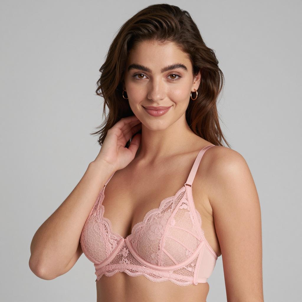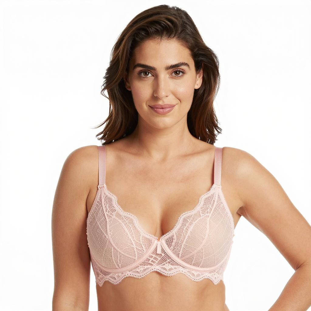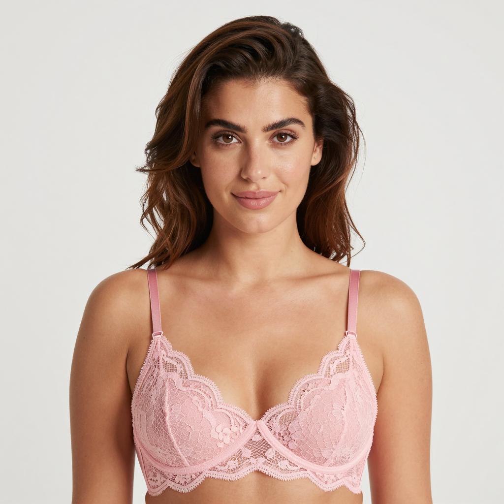 Woman with medium-length wavy brown hair, light skin, and brown eyes. She wears a pink lace bra, looking directly at the camera with a slight smile. Plain white background. Upper body shot. Light makeup. Frontal view.