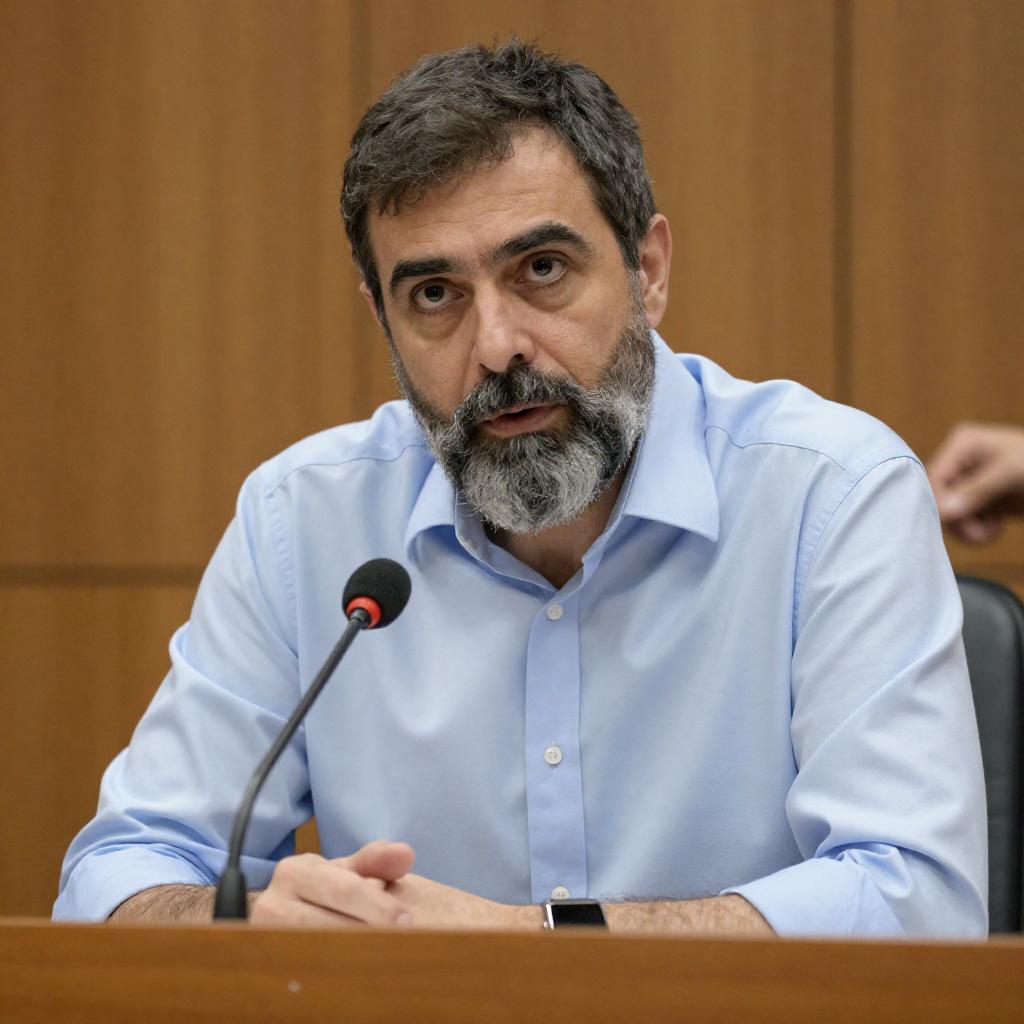 Photograph of a middle-aged man with wavy brown hair and glasses, wearing a dark blue pinstripe suit and light blue tie with a subtle pattern. He sits at a wooden desk, left hand on the desk, right hand resting on the table. Papers and a closed book are on the desk. Behind him is a wall with a framed poster and certificates. The man's facial expression is serious. One microphone is on the desk. The room has warm wooden walls.