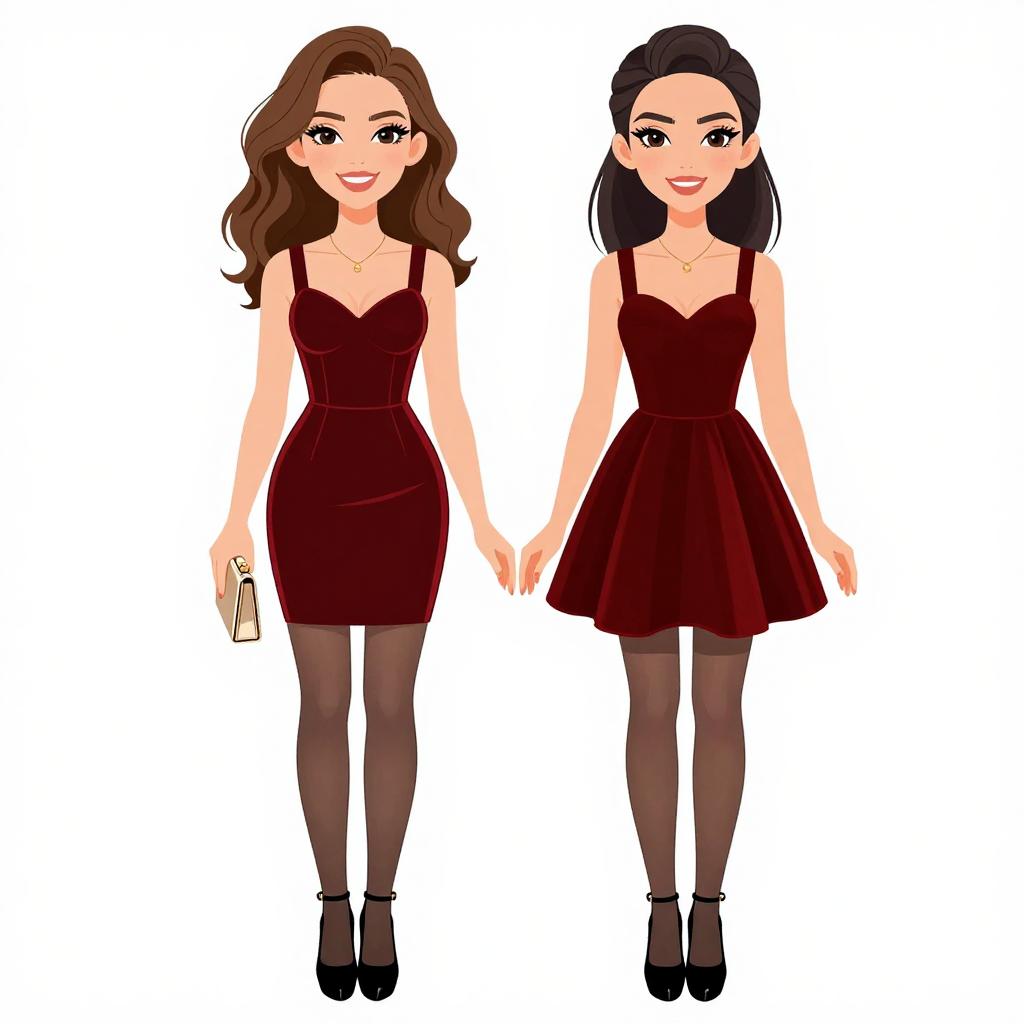 Woman with pretty face and pretty hair. smiling Woman, cocktail attire, deep red velvet mini dress, V-neckline, sleeveless, fitted waist, flared skirt, sheer black pantyhose, black velvet platform heels with ankle straps, holding a metallic clutch, minimal jewelry with a delicate gold necklace, white studio background. --sref 1467