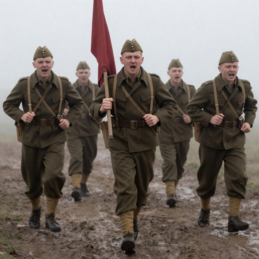 Photograph of a historical reenactment scene with a group of soldiers in World War I-era uniforms and helmets, gathered around motorcycles and bicycles on a dusty, grassy field. Smoke rises from the right side, and trees form the background. Soldiers are in various poses, some standing, others bending over the bikes.
