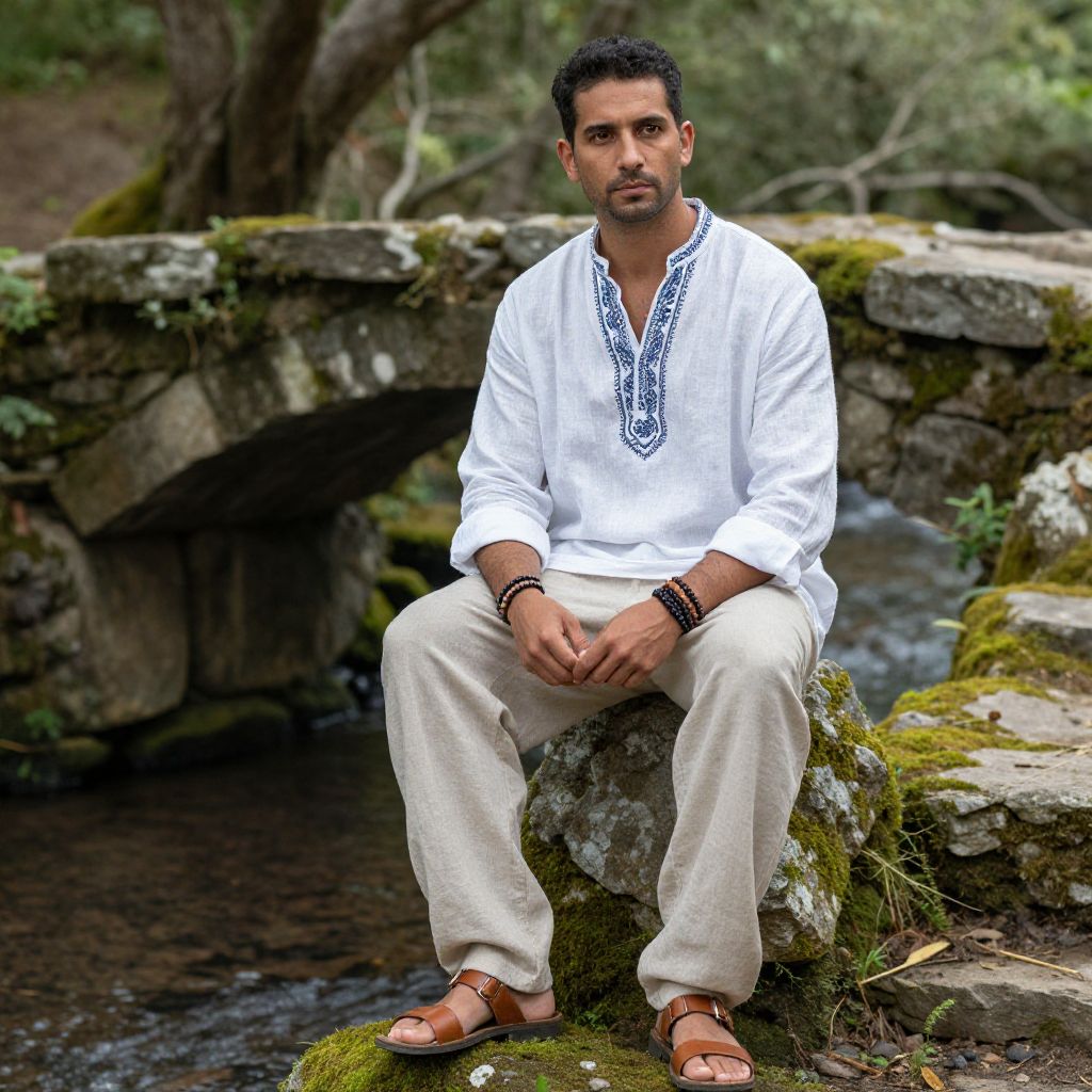 A man, flowy white linen shirt, intricate blue embroidery, relaxed-fit beige trousers, soft brown leather sandals, layered beaded bracelets, ancient stone bridge, overgrown with moss, tranquil stream flowing beneath, soft light filtering through trees, contemplative expression. Man has masculine face and piercing eyes