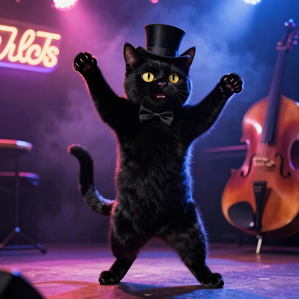 Dancing black cat wearing a tiny top hat and bow tie on a jazz club stage, smoky atmosphere, neon lights, energetic pose, expressive eyes, vintage style