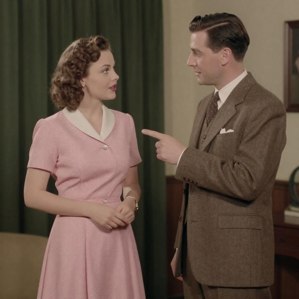 A vintage photograph of a man and woman in a 1940s-style setting. The man, in a brown tweed suit and white shirt, points at the woman, who wears a pink, patterned dress with a white collar. They stand in a room with a green curtain in the background. The image has a nostalgic, retro feel.