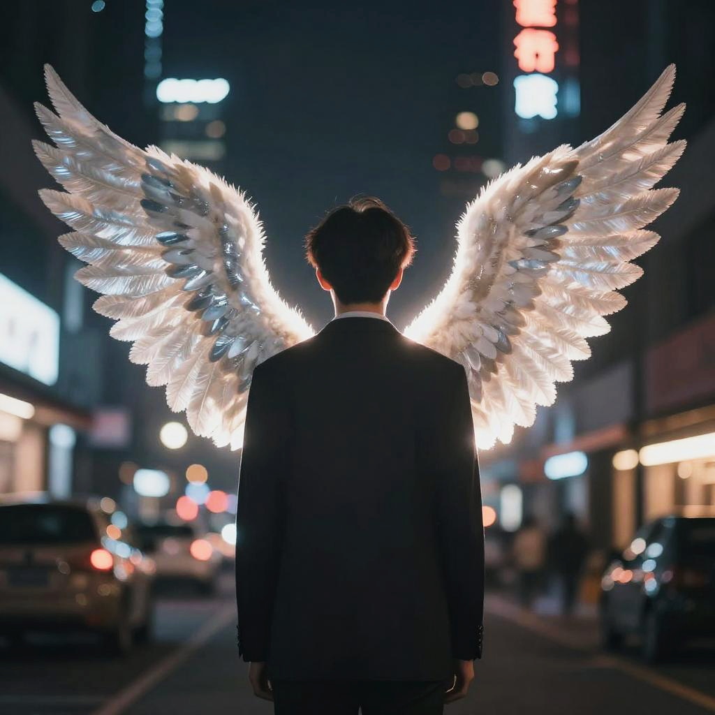 Add angel wings to a photo online free, subtle silver and white wings blending seamlessly behind a person’s silhouette against a dreamy urban nightscape with neon lights, soft glowing aura around the wings, modern surreal photo edit style