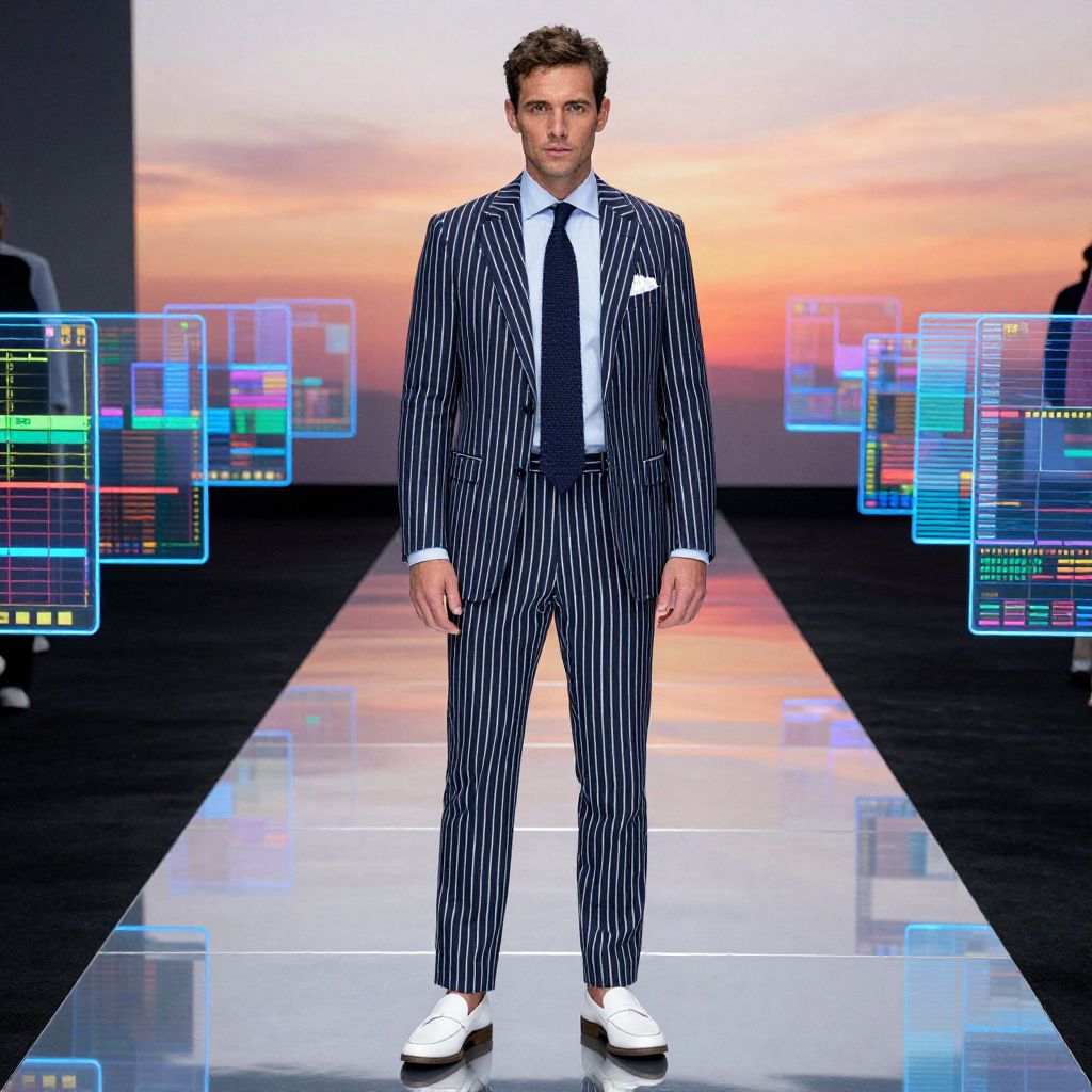 A man, navy and white striped seersucker suit, tailored silhouette, light blue oxford shirt, dark blue knit tie, white leather slip-ons, sleek futuristic terminal, holographic displays, shimmering runways under a glowing sunset, technicolor analog film stock, confident expression. Man has masculine face and piercing eyes