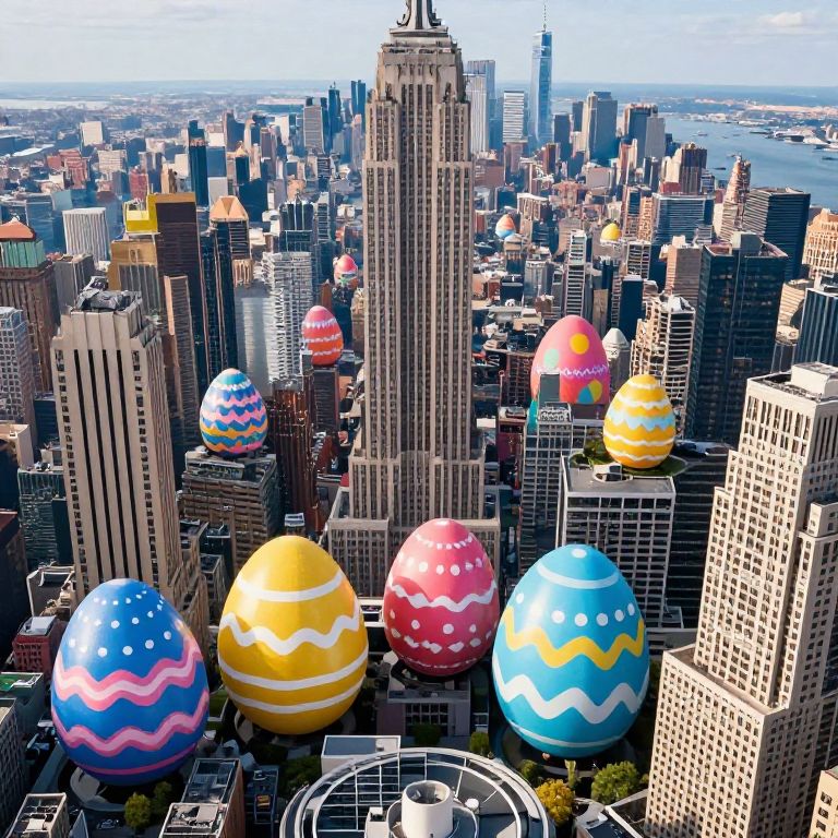 Ink Capacity areal view on manhattan with gigantic colourful easter eggs spread in between the buildings. the eggs are of similar size as the highrise buildings.,