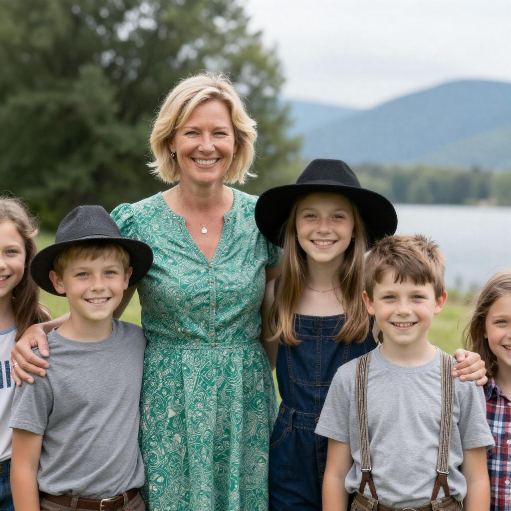Photograph of six children standing on a green grassy field. Five in foreground: three girls, two boys; one girl in blue dress with red belt, two boys in dark clothing, one girl in red dress. One boy in yellow shirt standing behind. Background: colorful balloons, candy cane, spherical decorations. Bright yellow sky. Children's expressions neutral to slightly smiling. Grass field extends to horizon.