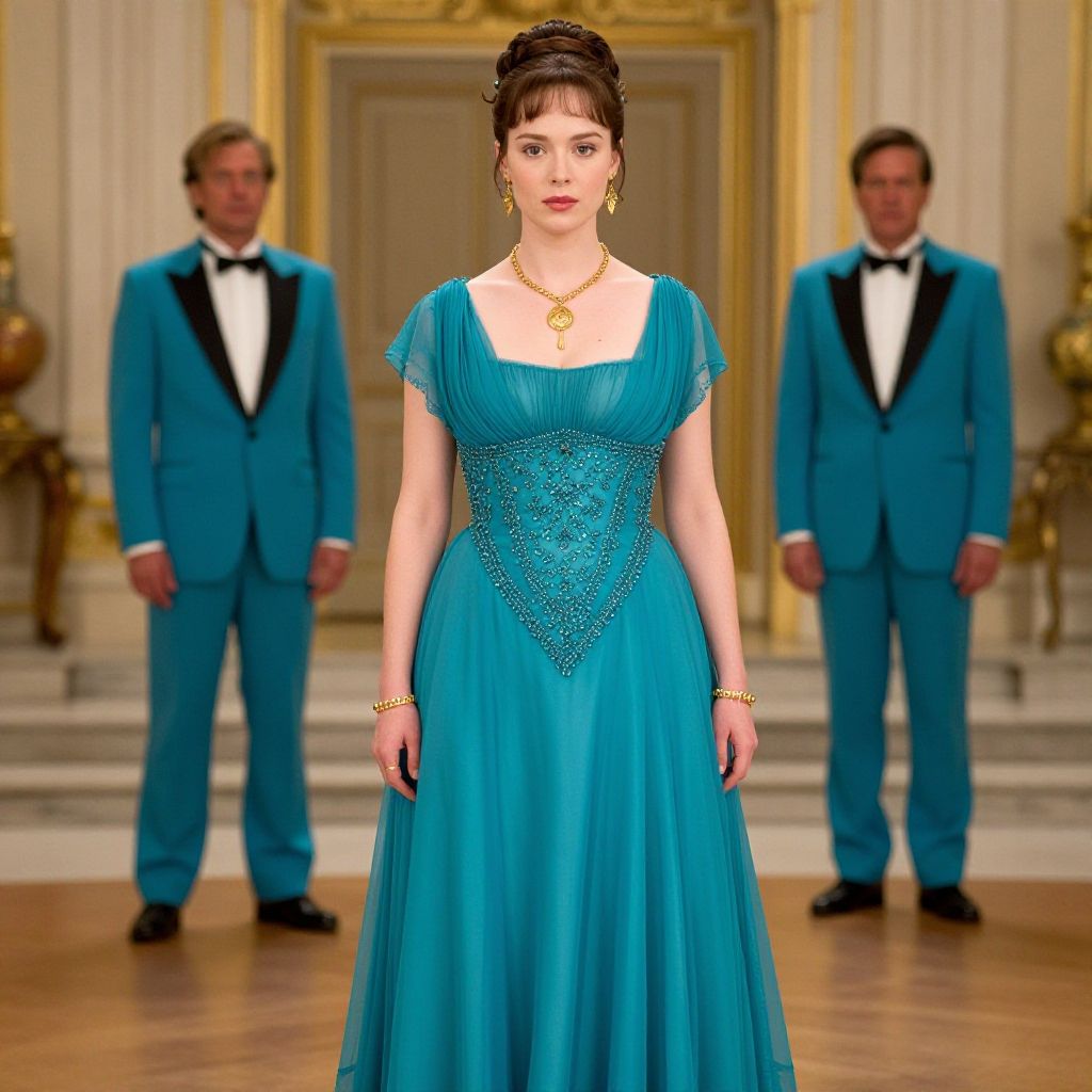 Elegantly dressed woman in a vibrant red gown adorned with lace detailing and a sparkling diamond necklace stands gracefully in a grand room, surrounded by formally attired guests and ornate decor, evoking a scene reminiscent of \"Gone With The Wind.\