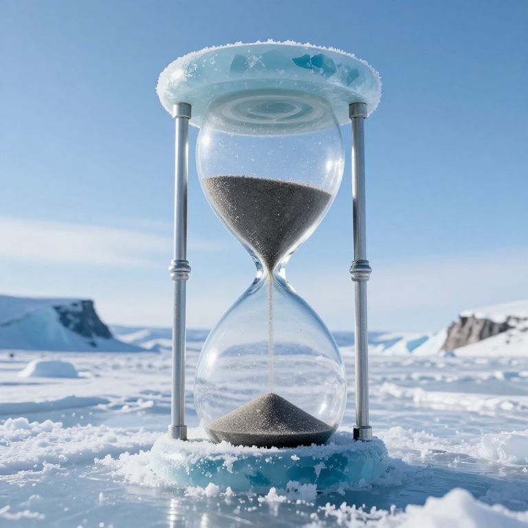 A colossal hourglass, encased in ice, stands defiantly against a desolate polar landscape, its sands flowing eternally between realms of frost and time.