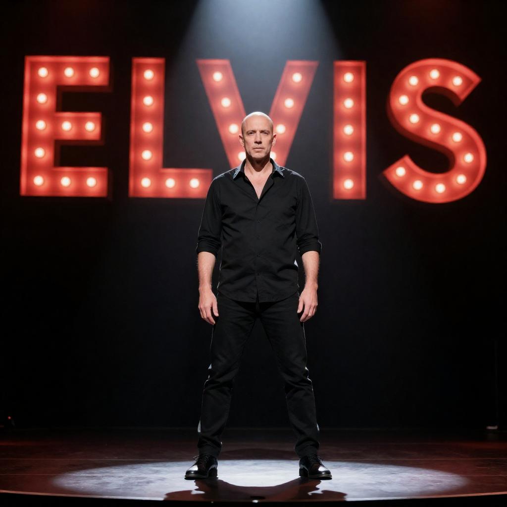 Photograph of a bald man in a black shirt and pants standing on a stage, illuminated by a spotlight. He stands in front of a large, red, illuminated "ELVIS" sign on a black background. His hands are relaxed by his sides.